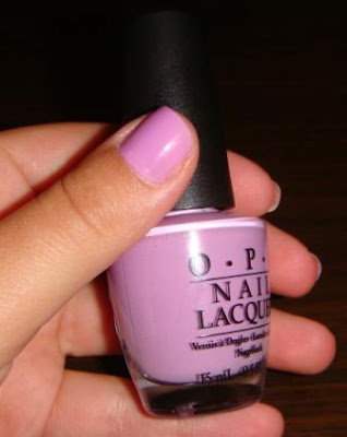 Mai jos, swatch cu O.P.I. – Lucky Lucky Lavender, o nuanta intre roz si mov care pare foarte intensa in lumina naturala, insa foarte pala seara, in lumina artificiala. Este o culoare foarte interesanta, extrem de feminina, la limita intre diafan si senzual. Eu am apucat sa o pozez numai seara, din pacate. Ziua, are o culoare mult mai intensa.